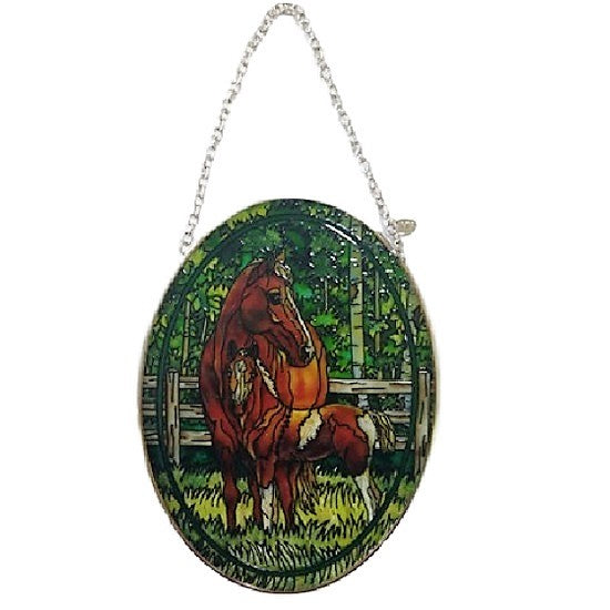 Vitrail avec une illustration d'une jument et son poulain. Dimensions: 7"x 5".