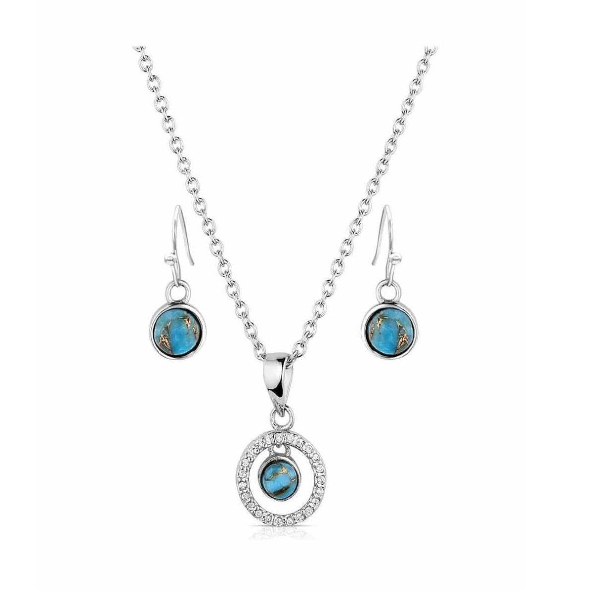 Ensemble de bijoux Clear Creek de Montana Silvermith. Le pendentif est orné d'une pierre turquoise ronde sertie de cristaux de zircone cubique transparents et les boucles d'oreilles sont ornées d'une simple pierre turquoise circulaire à bordure argentée lisse