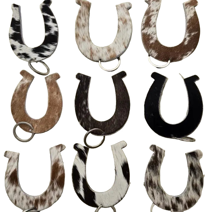 Porte-clé en forme de fer à cheval avec poils de vache véritable. Dimensions : 3 x 3.5 po.