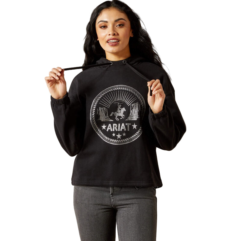 Chandail kangourou Ariat Essential pour femmes. Le cordon de serrage à la taille crée une silhouette flatteuse, tandis que l'imprimé western lui confère une touche de style.
