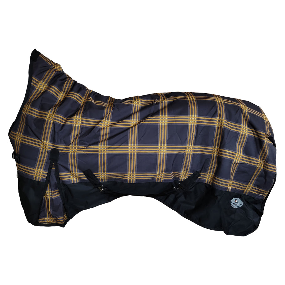Couverture d'hiver avec isolation de 300g. Imperméabilité de 600D. Elle possède un demi-cou ainsi qu'une sursangle croisée sous le ventre et au niveau des cuisses. Un rajout au niveau des épaules à également été mis pour permettre une plus grande liberté de mouvement.