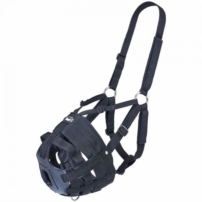 Musolière de pâturage qui permet de contrôler la quantité d'herbe ingérée. La courroie en forme de V au dessus du nez aide à garder la musolière bien en place. Les trous large à l'avant permettent à votre cheval de respirer plus facilement.