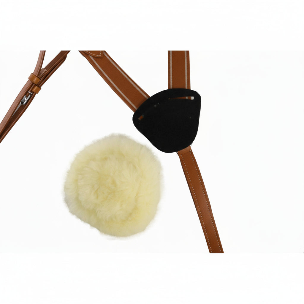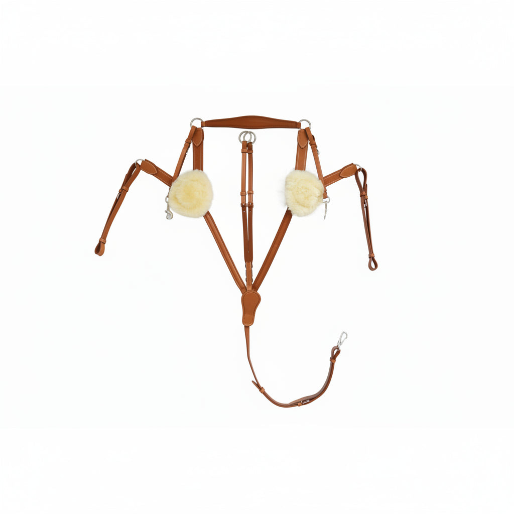 Une martingale de saut doté d'une fixation à 5 points en cuir, d'inserts élastiques et martingale à anneaux amovible.