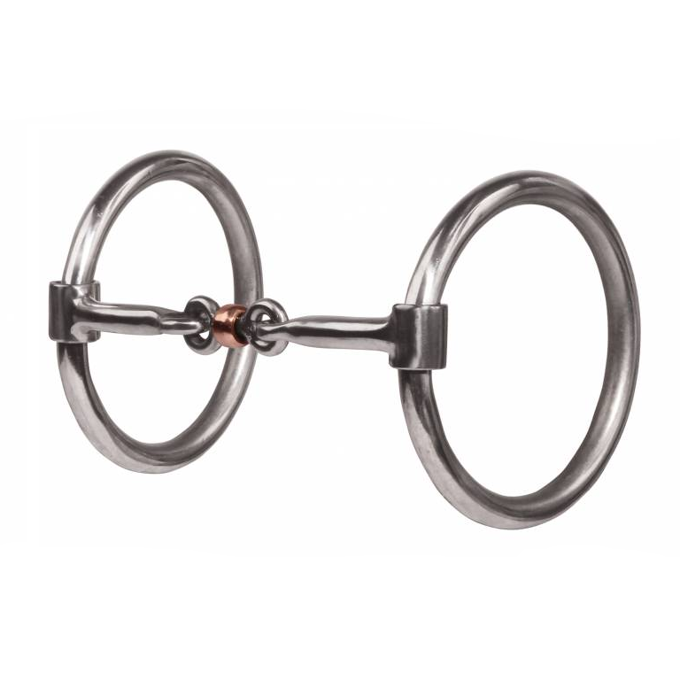 Mors Loose Ring à double brisure . Le mors aux anneaux tournants garantit qu’il sera toujours dans un angle adapté pour le cheval. L'embouchure double brisure exerce une pression mieux balancée dans la bouche. Il évite l'effet '' casse-noix '' et les pressions au niveau du palais. La double brisure '' dogbone '' est couverte par une rondelle de cuivre amovible qui incite le cheval à saliver donc, à détendre sa mâchoire. Idéal pour les chevaux de type anxieux ou joueurs. Largeur de l'embouchure: 5 1/4''.