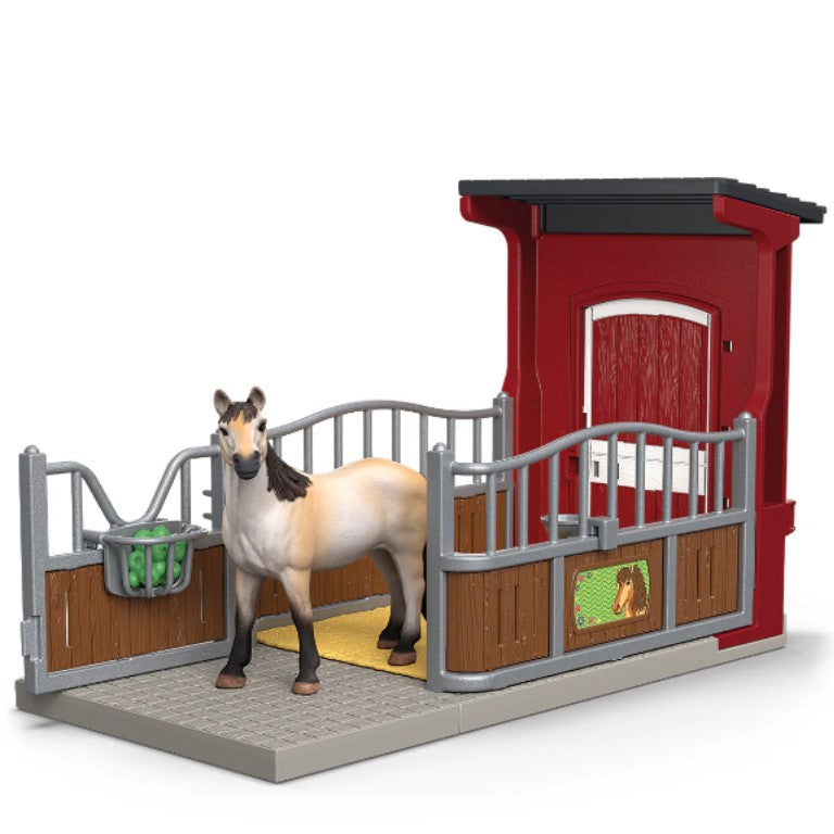 Le box avec la jument Mustang sont très jolie. On peut même la décorer avec des autocollants. Comment s'appelle la belle jument ? Une chose est sûre : les pommes sont son en-cas préféré. Il y en a plusieurs qui l'attendent sur le râtelier. Qui donnera un nom à cette belle jument ?