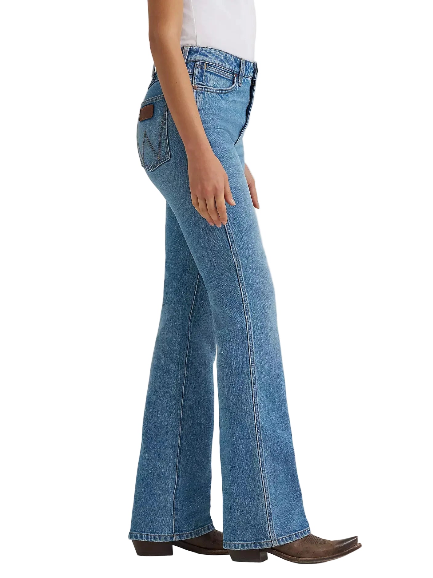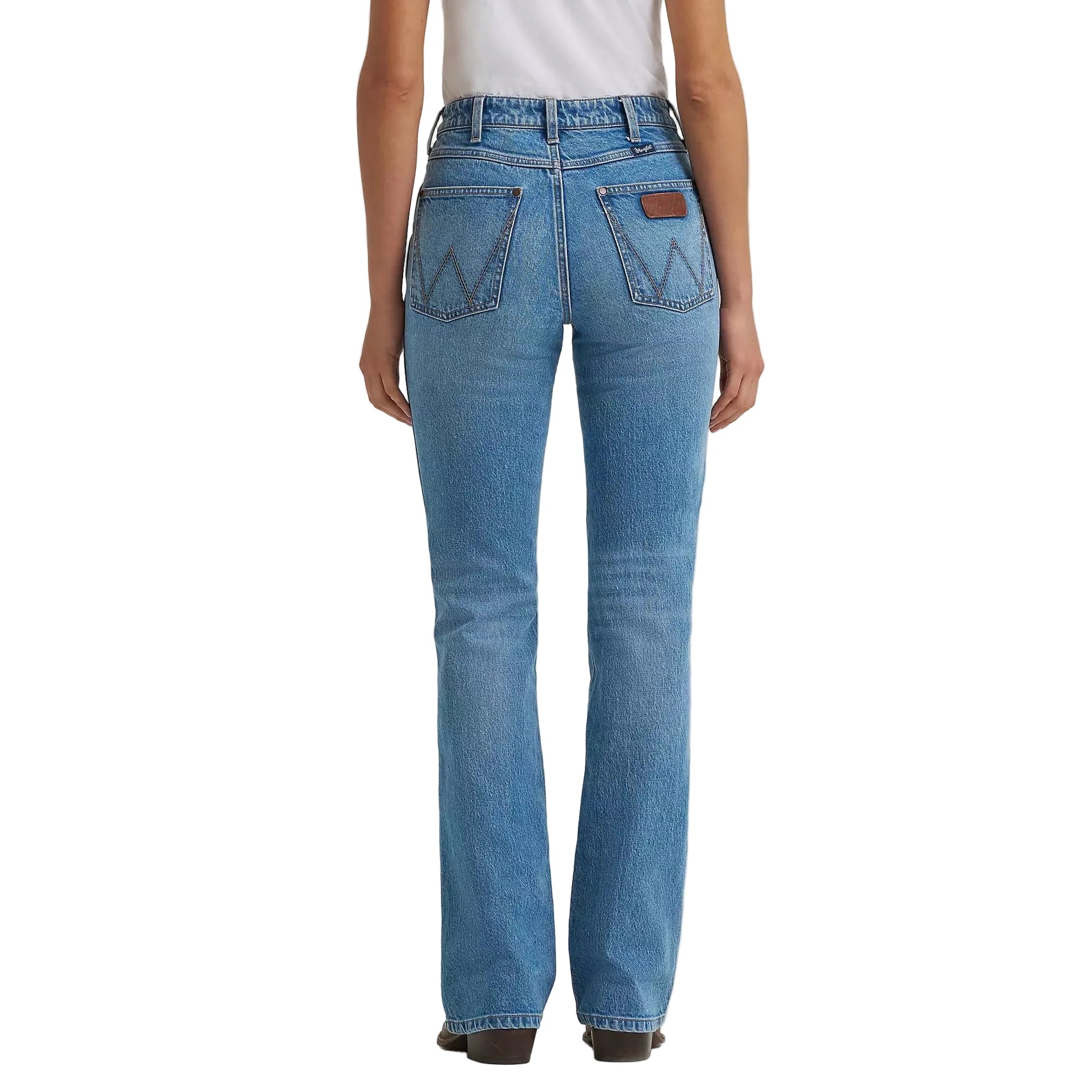 Jeans Wrangler Bailey Boot Mary pour femmes. Flatteur sous tous les angles, ce pantalon en denim est confectionné dans un mélange de coton avec juste une touche de stretch pour un confort tout au long de la journée. Ils présentent un style retro avec une silhouette taille haute, une coupe ajustée au niveau de la cuisse et une jambe juste assez large pour une botte.