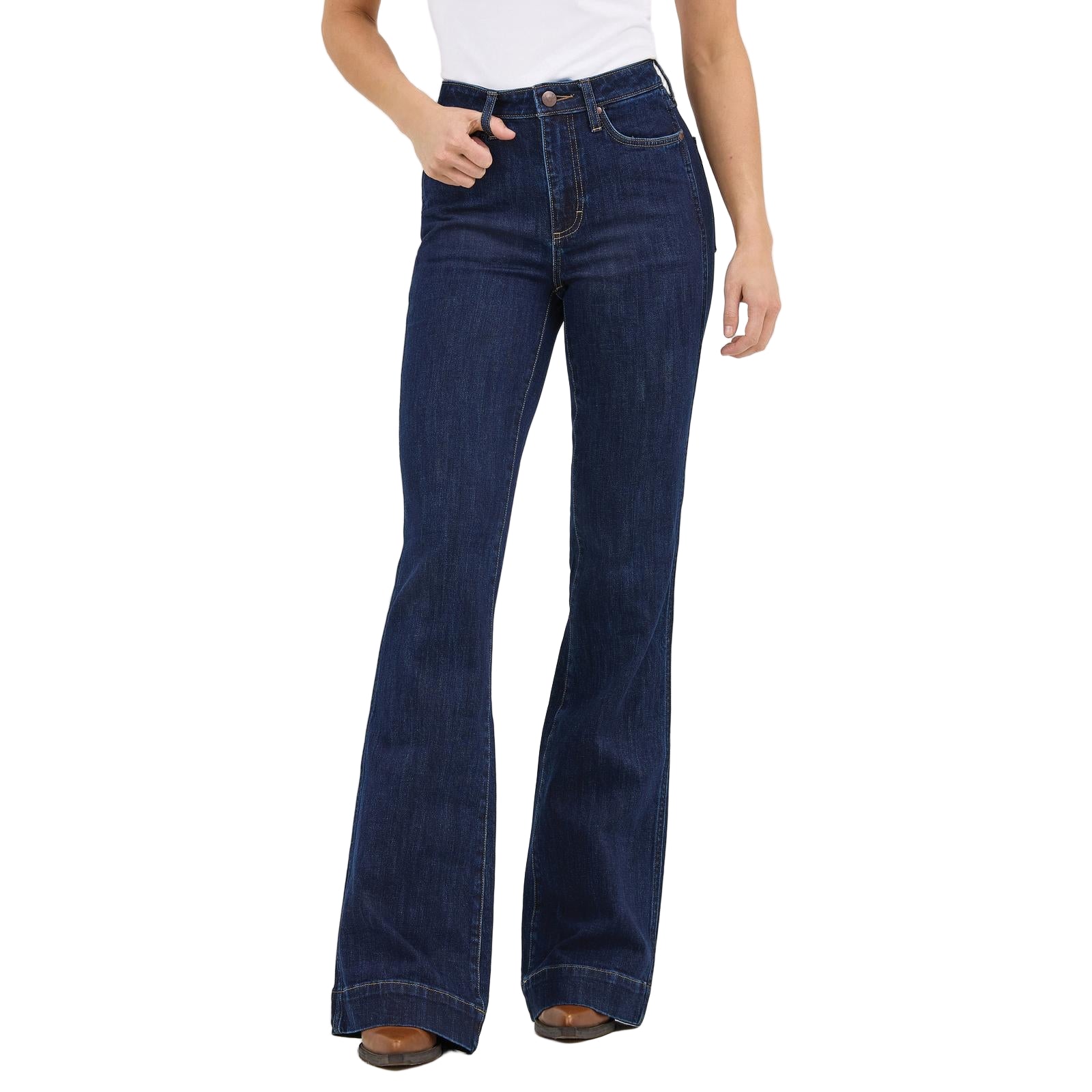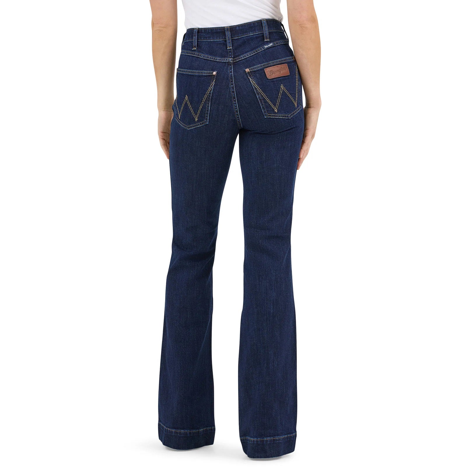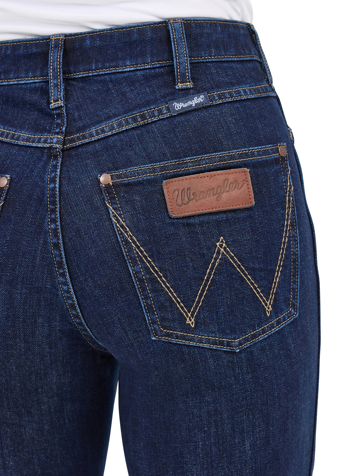 Jeans Wrangler Bailey Trouser pour femmes. Flatteur sous tous les angles,ce pantalon en denim est confectionné dans un mélange de coton avec juste une touche de stretch pour un confort tout au long de la journée. Ils présentent un style retro avec une silhouette taille haute, une coupe ajustée au niveau de la cuisse et une jambe évasée de 20,5".