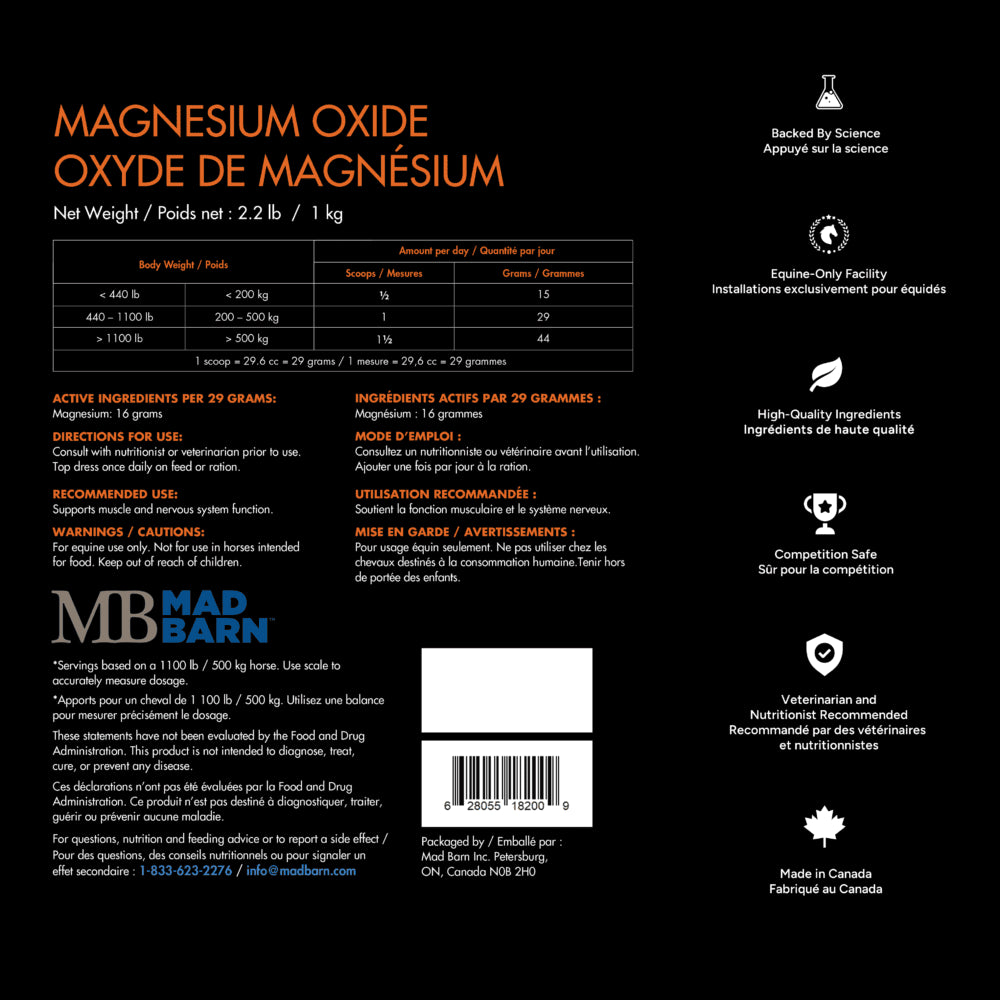 L’oxyde de magnésium de Mad Barn favorise le bon fonctionnement des muscles et un système nerveux sain chez les chevaux. Ce minéral essentiel est nécessaire à la croissance osseuse, au fonctionnement métabolique et à la santé des sabots. Il a été démontré qu’une supplémentation en magnésium a un effet calmant chez les chevaux nerveux.