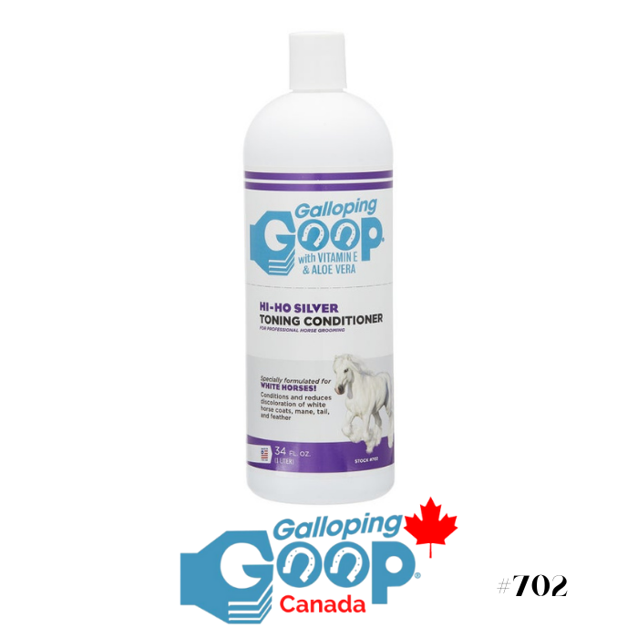 Ce revitalisant est conçu pour rehausser les tons blanc, gris et argent de votre cheval. Il contient des azurants optiques naturel et des pigments réfléchissant la lumière. Non seulement il hydrate, il répare, mais il illumine et blanchit les crins et le pelage pour les laisser doux et brillants. Il inverse les dommages laissés par la saleté et les tâches jaunâtres. Sa formule est riche en aloès et en vitamine E pour prendre soin de la peau de votre compagnon. Notre conditionneur est testé pour un pH équilibré qui convient à tous les chevaux et animaux de la ferme même ceux qui ont une peau sensible. Comme pour tous nos produits Galloping Goop, ce revitalisant est fabriqué à partir d'ingrédients haut de gamme de qualité cosmétique. Il est sans silicone, sans produits chimiques, non toxique et biodégradable. Format 1L.