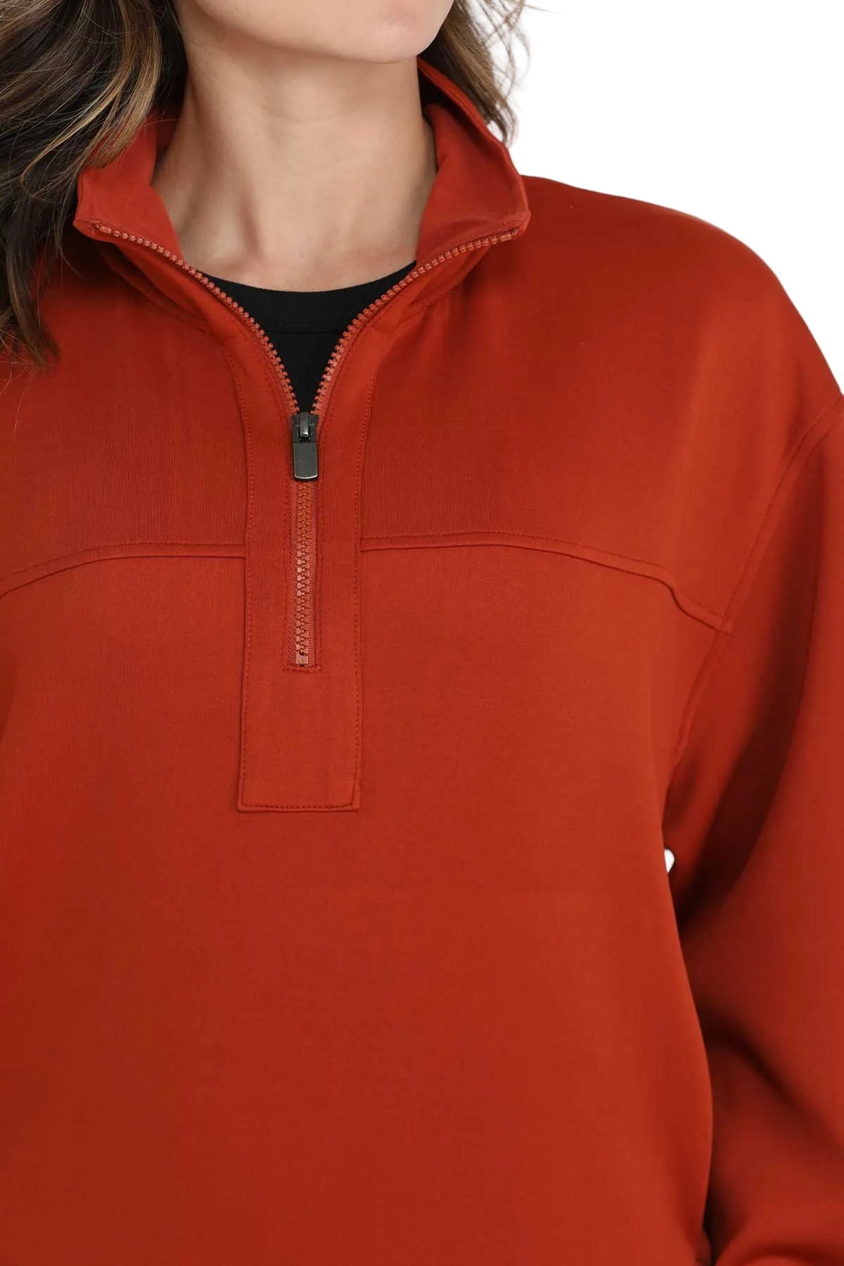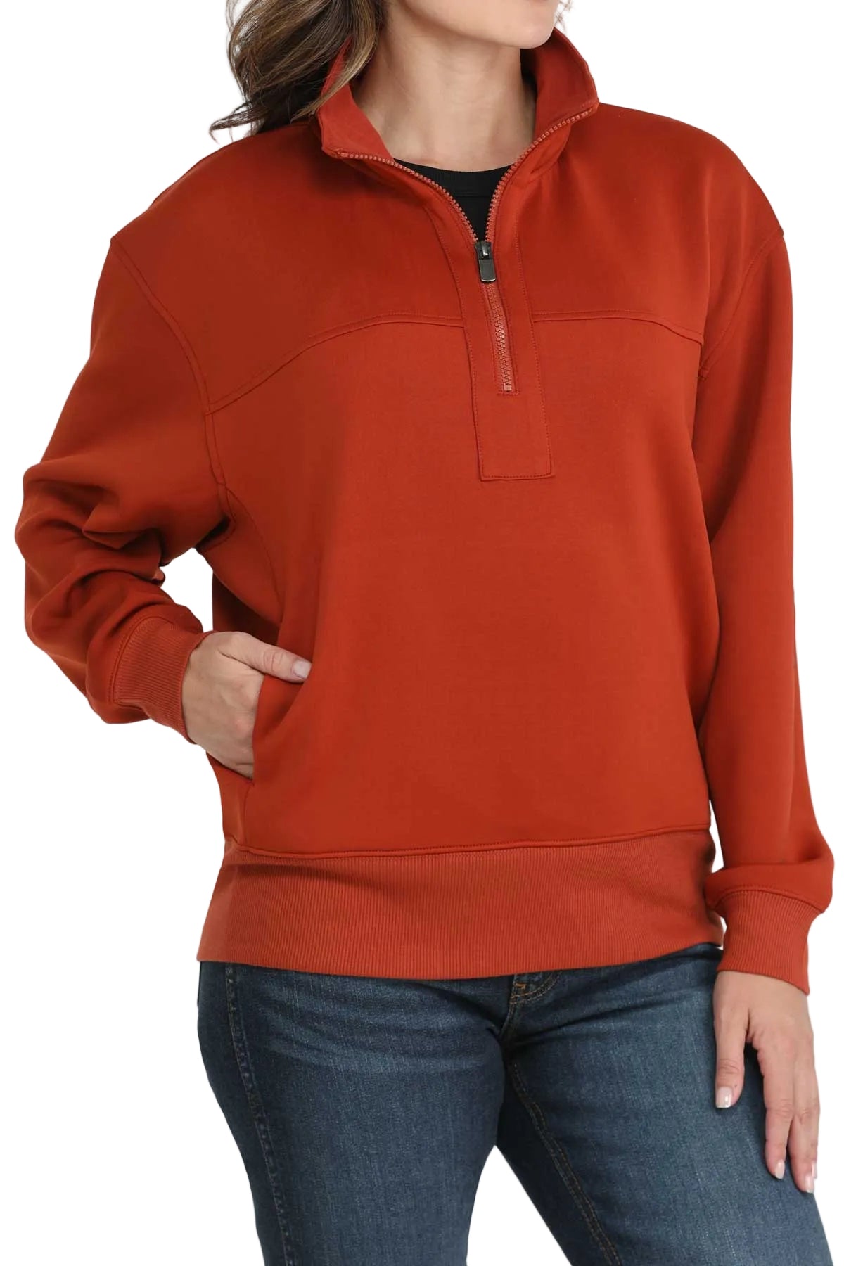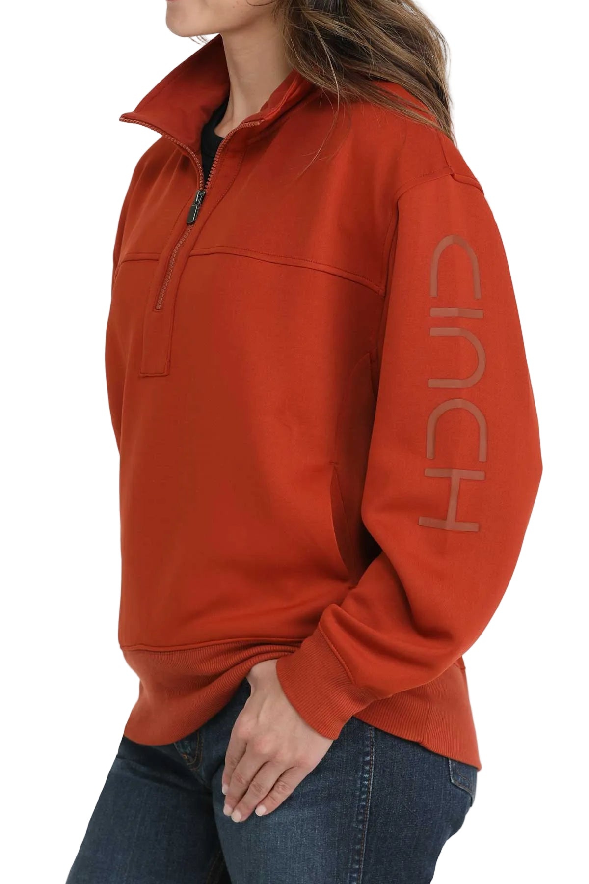 Chandail 1/4zip Cinch pour femme en maille scuba poly-spandex. Ce modèle confortable est doté d'un logo CINCH thermocollé et d'un quart de fermeture éclair avec bordures côtelées pour une isolation thermique optimale.