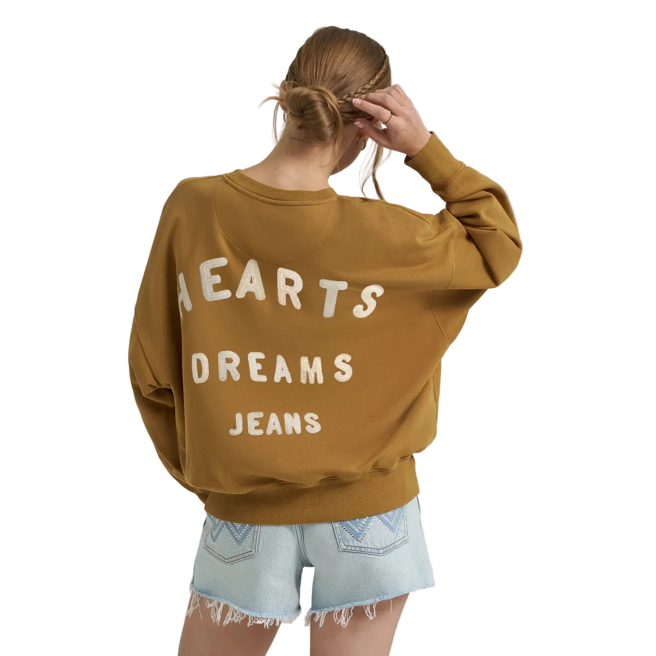 Adoptez le style Lainey Wilson avec ce sweat-shirt Wrangler ultra-confortable ! Sa coupe décontractée et ses manches tombantes vous assurent un look sans effort. Au dos, il est brodé de l'inscription « Heart, Dreams, Jeans », un clin d'œil à la reine de la country.