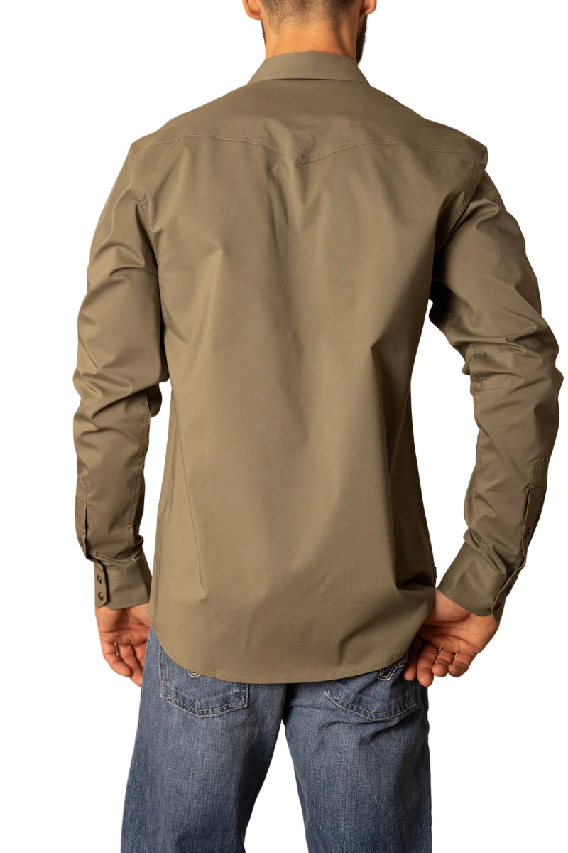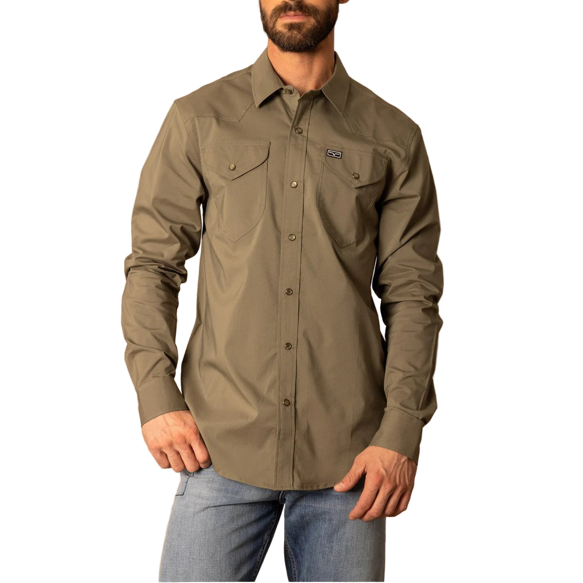 Chemise Kimes Ranch Blackout pour homme. La chemise Blackout est confectionnée en tissu Coolmax extensible et respirant. De couleur unie, elle regorge de détails western classiques : boutons-pression nacrés assortis sur le devant et fermant les deux poches poitrine, empiècement western et col montant. La Blackout est la chemise de travail western par excellence.