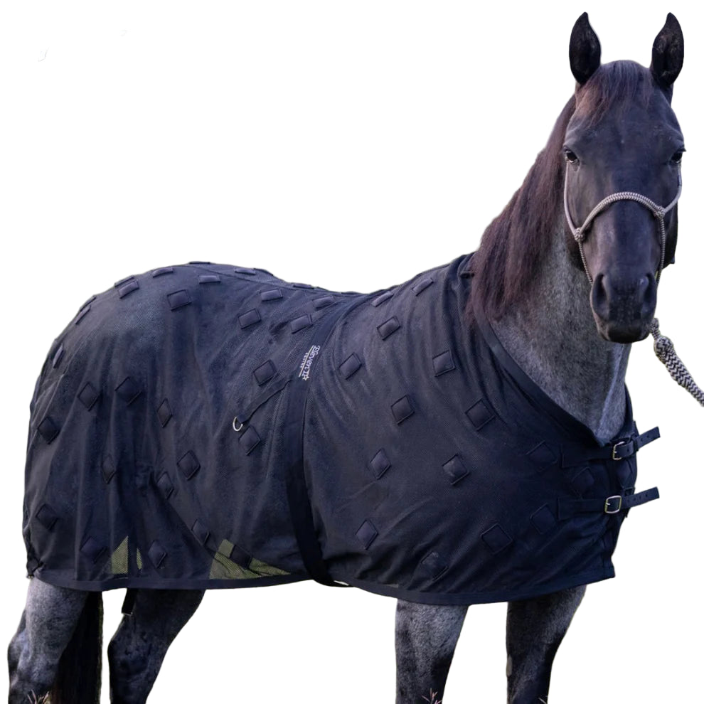 Notre maille comprend 88 aimants de qualité thérapeutique orientés avec la polarité nord et placés en fonction des points d'acupuncture et des vaisseaux sanguins du cheval pour des résultats plus rapides.