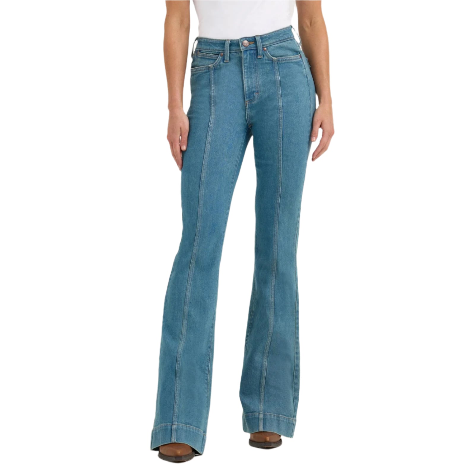 Jeans Wrangler Bailey Trouser pour femmes. Flatteur sous tous les angles,ce pantalon en denim est confectionné dans un mélange de coton avec juste une touche de stretch pour un confort tout au long de la journée. Ils présentent un style retro avec une silhouette taille haute, une coupe ajustée au niveau de la cuisse et une jambe évasée de 20,5".