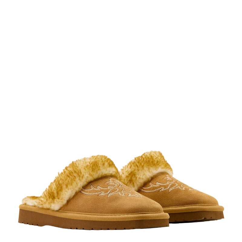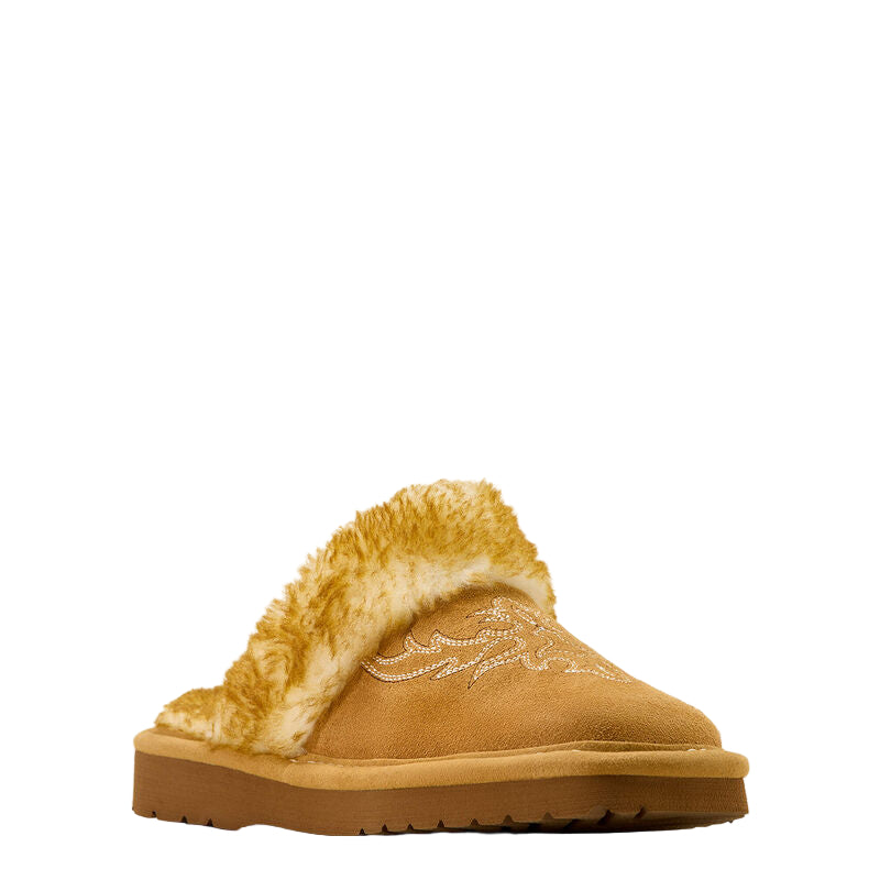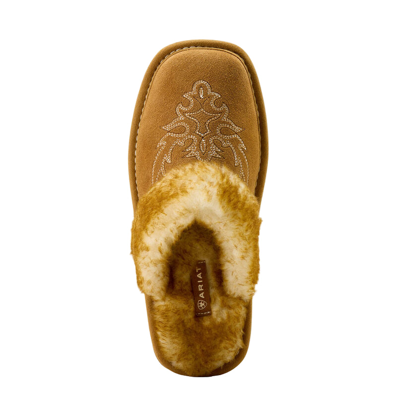 Pantoufles Ariat Jackie pour femmes. Ces chaussons doux à bout carré donnent un look western tout en étant décontractés et confortables.