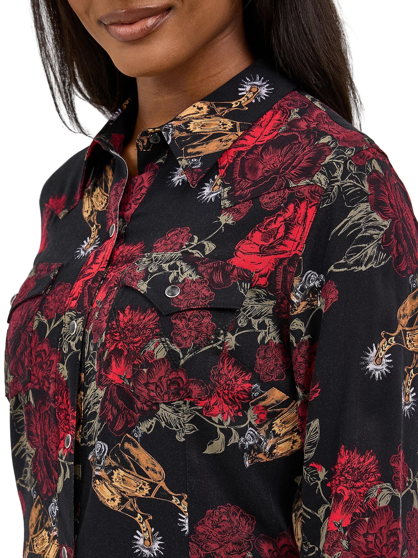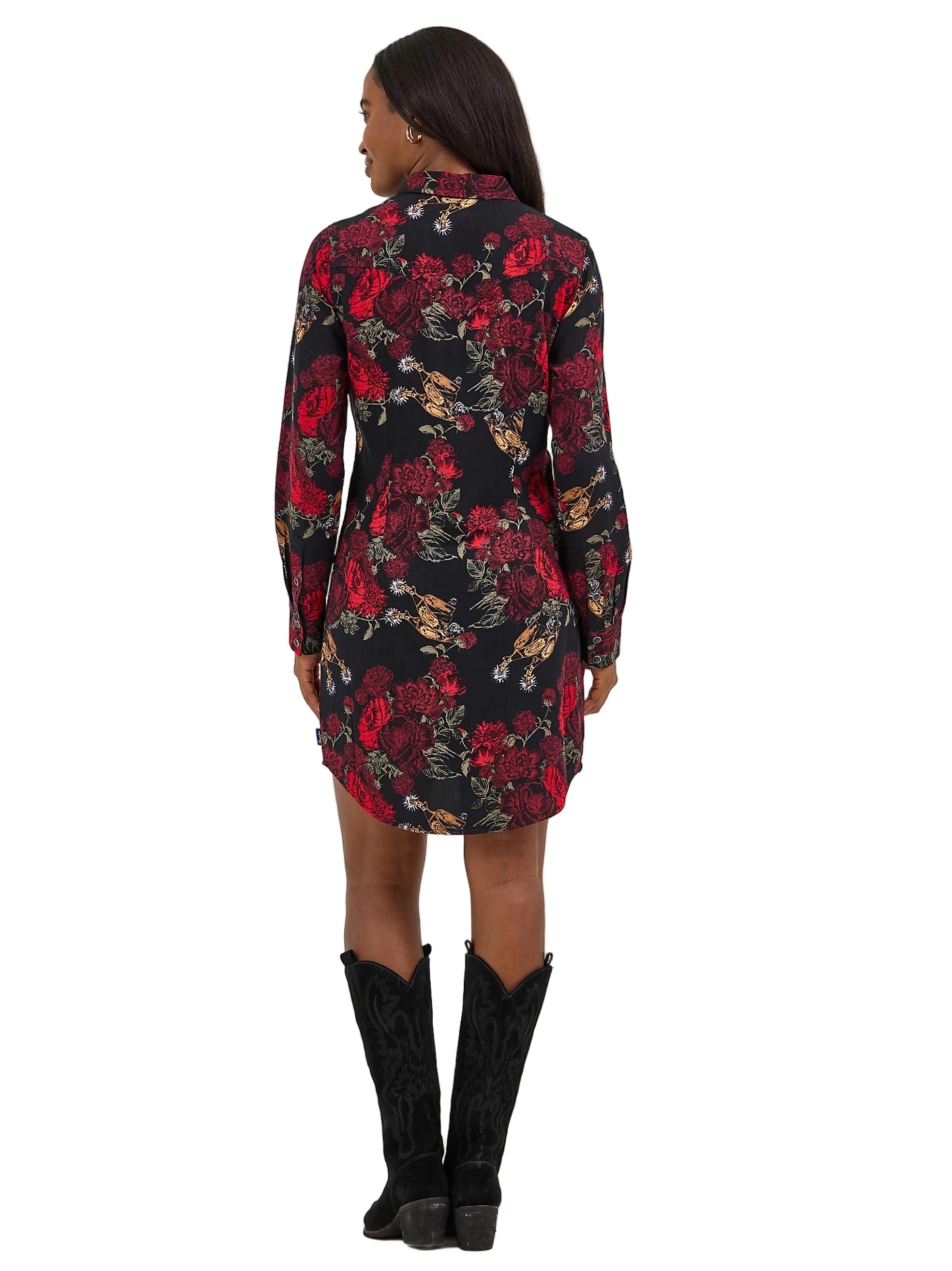 Adoptez les motifs floraux avec cette robe western à boutons-pression. Reprenant tous les détails que vous adorez de votre chemise à boutons-pression préférée, cette robe est dotée d'empiècements à un seul point de l'avant au dos, de poches à rabat poitrine ornées de la broderie « W » emblématique et d'un bouton-pression nacré sur le devant. Conçue pour le confort et la douceur, elle est agrémentée de pinces à la taille pour une meilleure définition et d'un imprimé romantique orné de fleurs rouges et d'éperons.