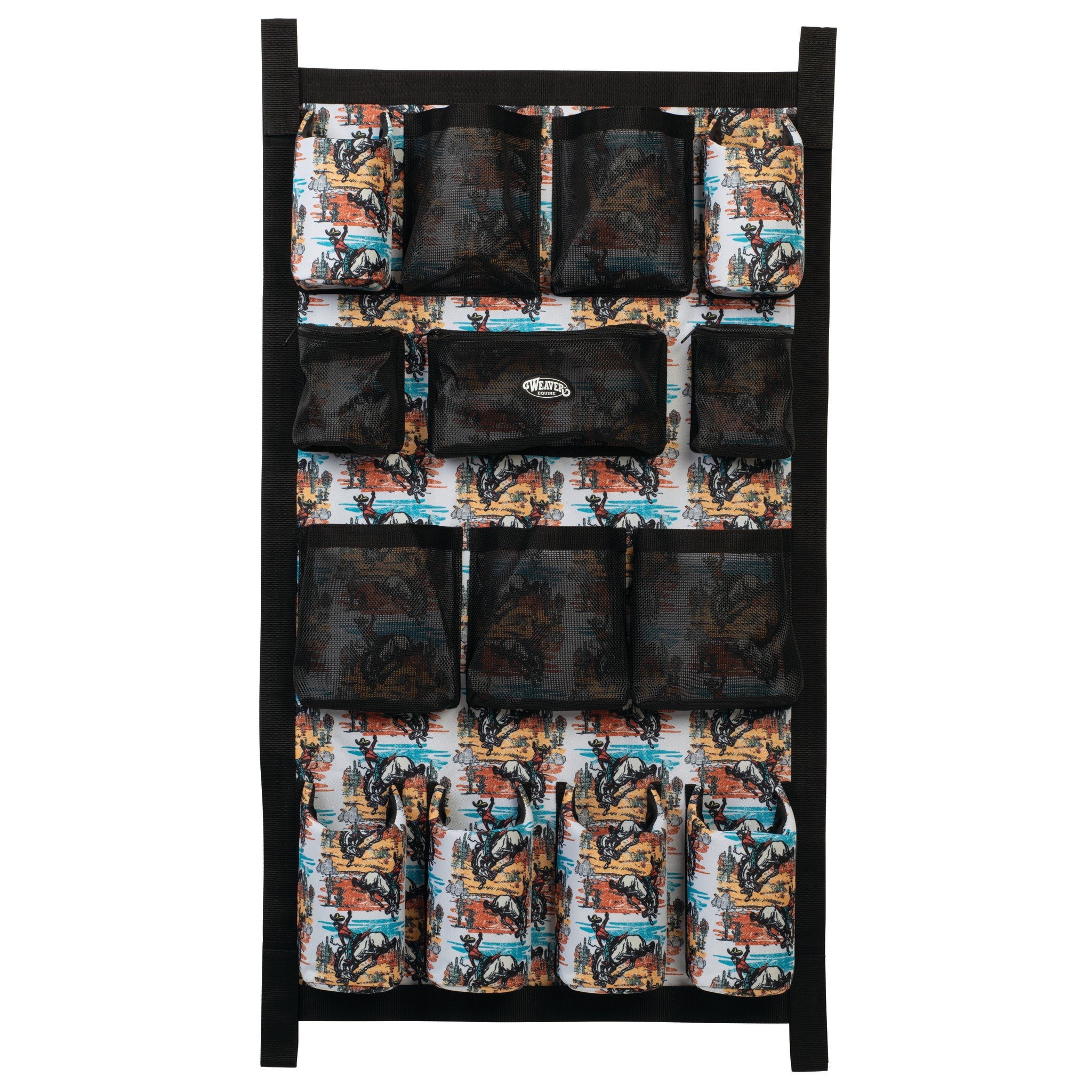 Sac à suspendre de Weaver Leather. Fait d'un polyester 600 deniers. Avec une variété de pochettes ouvertes et fermées pour y mettre brosses, peignes, bouteilles et plusieurs autres. Idéal pour utiliser à l'écurie ou dans une remorque. Dimensions : 23" x 39". Couleur : bronc.